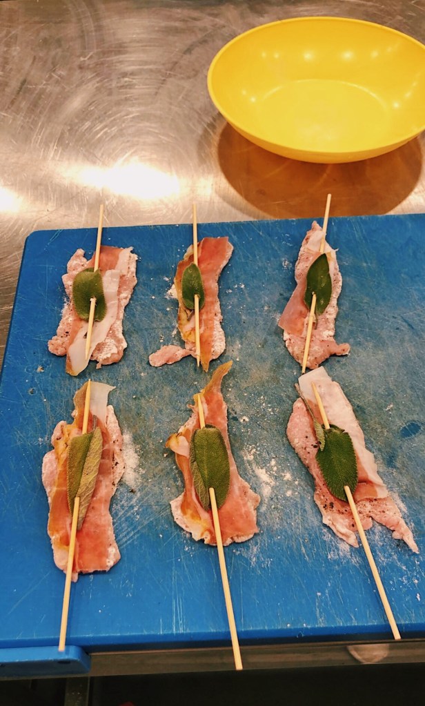 - Add a slice of prosciutto and a sage leaf on top of the veal. Using a wooden toothpick, poke down through the top of the meat and then back up, so that it is held together like a skewer.