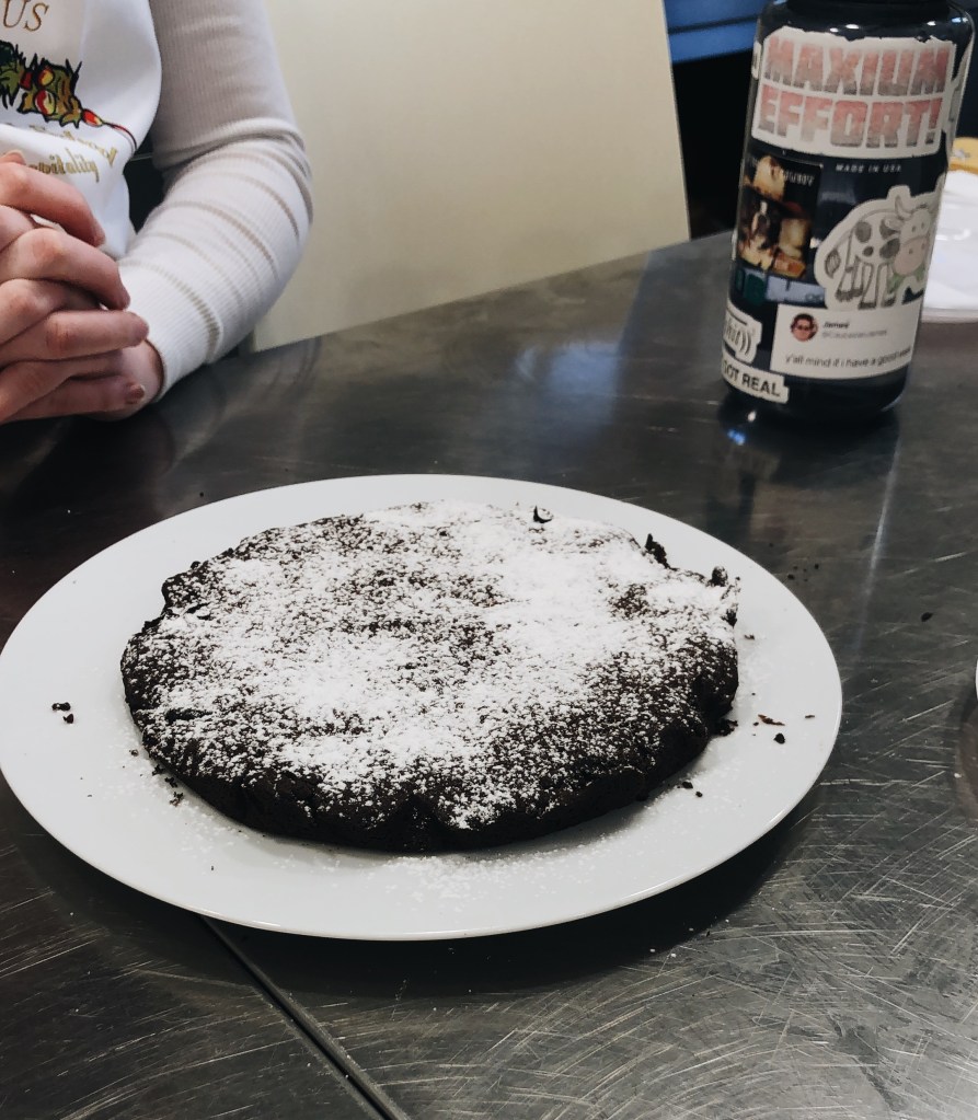 Ingredients: 1 cup dark chocolate, 2 eggs, 1/2 cup flour flour, 1/4 cup sugar, 1 stick butter, powder sugar for topping decoration