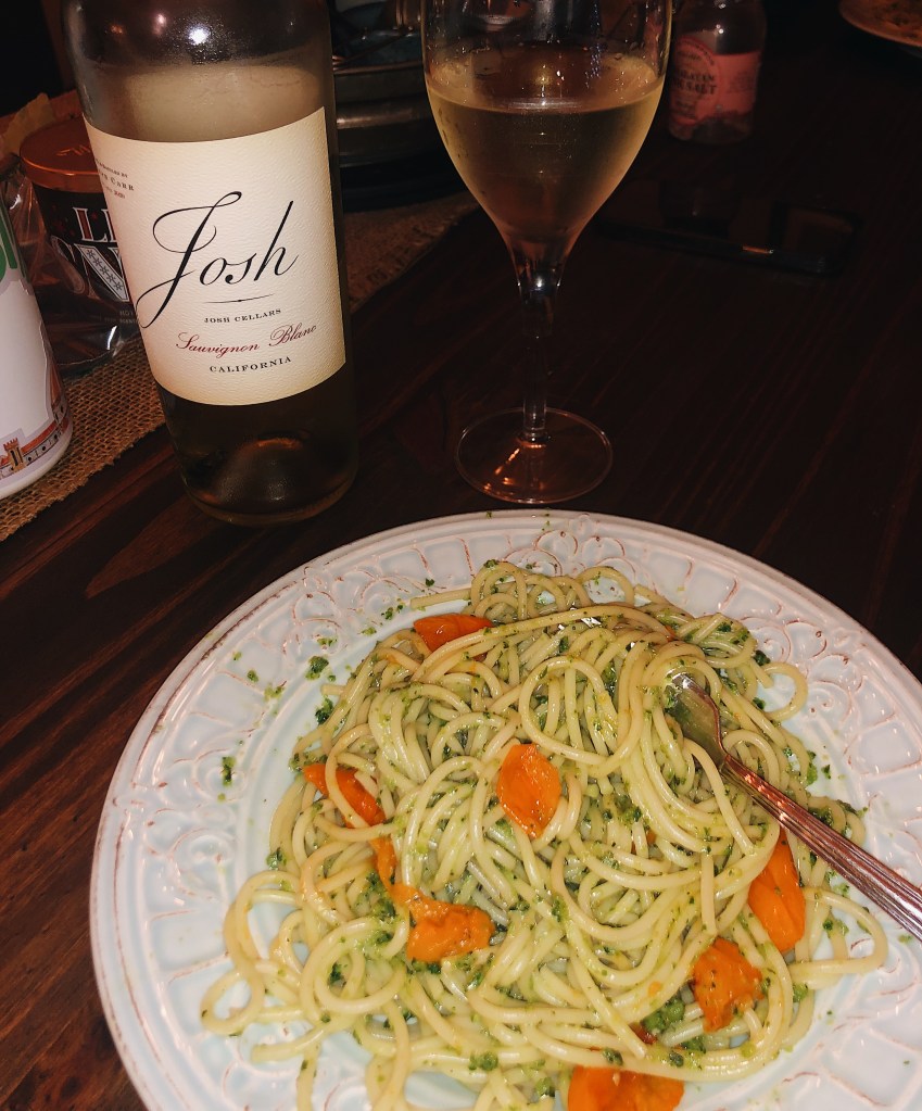 I LOVE a homemade pesto sauce! I put this sauce on spaghetti and added a couple sautéed, sweet grape tomatoes. Pair it with some white wine and you’ve got yourself a five star dinner! (Look at you already, turning into a little chef)